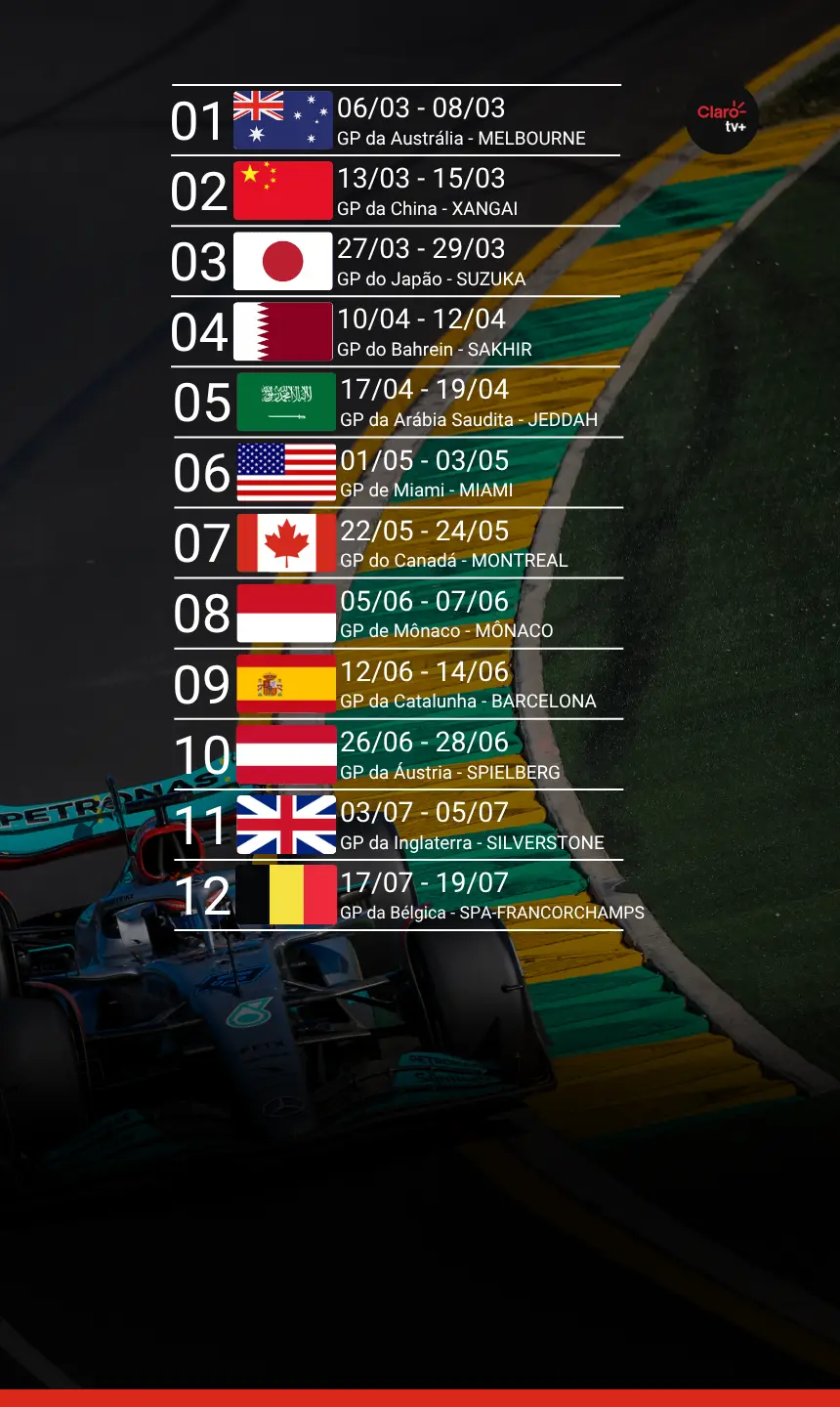 Se você não quer perder nada do que acontece nas pistas, seu lugar é na Claro. Assista ao vivo a todas as corridas de Fórmula 1 com F1® TV Pro.