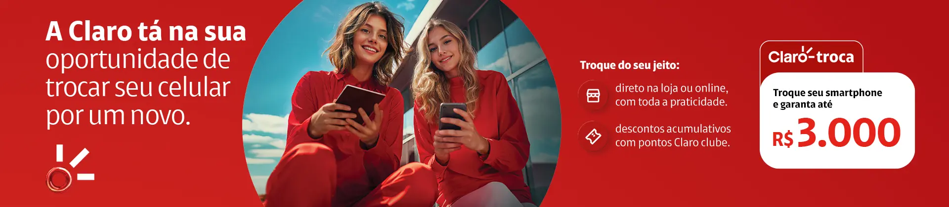 Oferta Claro troca: o programa permite que o cliente troque seu aparelho usado por um voucher utilizando o mesmo como parte do pagamento na compra de um aparelho novo, válido para pessoa física. O voucher deverá ser utilizado nas lojas Claro, no mesmo dia e na mesma loja da geração do voucher. Consulte condições, restrições e mais informações em www.claro.com.br/celular/pos/claro-troca