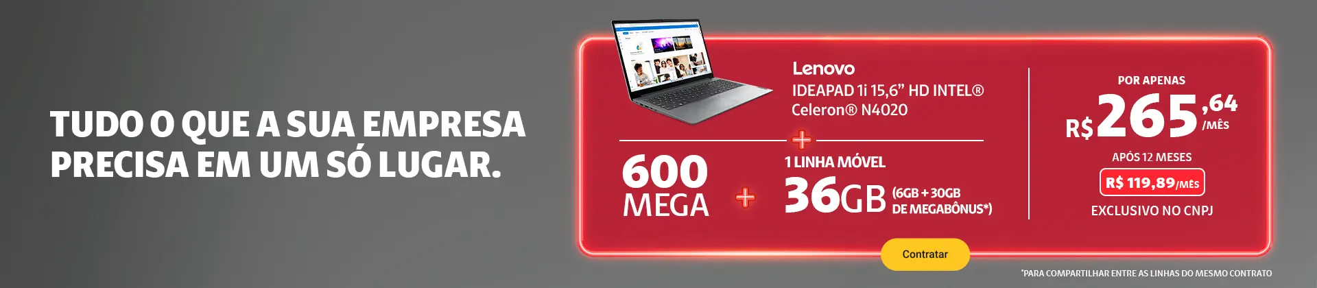 Oferta válida para cliente pessoa jurídica com CNPJ destinada exclusivamente para São Paulo (cidades com DDD11). Notebook Lenovo parcelado no cartão de crédito em até 12x. Notebook Lenovo IdeaPad1i 15,6” HD Intel Celeron possui 1 licença da solução Microsoft 365 Personal incluso. Contratação sujeita à análise de crédito, fidelização de 24 meses e multa contratual para os serviços. O pagamento do equipamento acontece de forma apartada, através de link enviado sujeito à aprovação do limite no cartão de crédito. A rede não é composta integralmente por fibra ótica. O trecho final de conexão é composto por cabos coaxiais. Consulte cidades com rede fibra. Consulte condições de contratação, benefícios inclusos, restrições no Regulamento da oferta, disponibilidade técnica, cobertura no seu endereço e mais informações sobre essa oferta combinada de serviços e Notebook Lenovo em claro.com.br/empresas, por meio do telefone 0800 721 0027 para produtos Fixos e ou pelo 1052 para produtos Móveis, ou com consultor Claro empresas. O wi-fi mais estável do Brasil com base na análise da Ookla® dos dados do Speedtest Intelligence® do Q1–Q2 2023.
