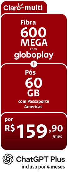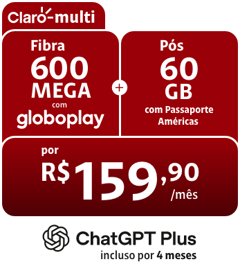 No Claro Multi, você ganha de presente 4 meses de assinatura do ChatGPT Plus e garante R$ 400 de economia no seu bolso. É a sua chance de aproveitar a nova geração da fibra em casa e o 5G mais rápido do Brasil no celular com a melhor inteligência artificial.