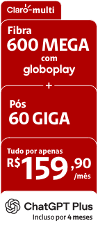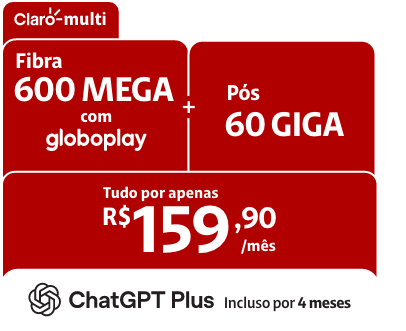 Dependendo da cidade e localidade, a rede fixa não é composta integralmente por fibra ótica: o trecho final de conexão é composto por cabos coaxiais; consulte os endereços com rede 100% fibra ótica. Oferta Chat GPT Plus grátis por 4 meses válida na contratação de 600 mega + Claro Pós 60GB no Multi (25GB + 25GB para redes e vídeos + 10GB de bônus) E/OU Box Claro tv+. Consulte disponibilidade técnica, condições de contratação desta oferta, ativação, condições de uso, resgate do voucher Chat GPT Plus e mais informações em https://claro-e.com/jQR2I ou ligue para 1052. 5G mais rápido com base em dados de Ookla® Speedtest Intelligence® do primeiro semestre de 2025. Mais informações sobre ChatGPT Plus acesse: https://claro-e.com/2BTfK