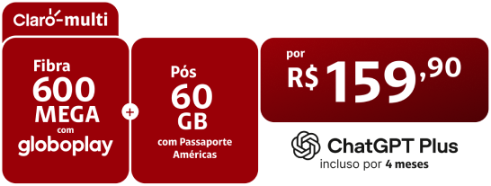 No Claro Multi, você ganha de presente 4 meses de assinatura do ChatGPT Plus e garante R$ 400 de economia no seu bolso. É a sua chance de aproveitar a nova geração da fibra em casa e o 5G mais rápido do Brasil no celular com a melhor inteligência artificial.