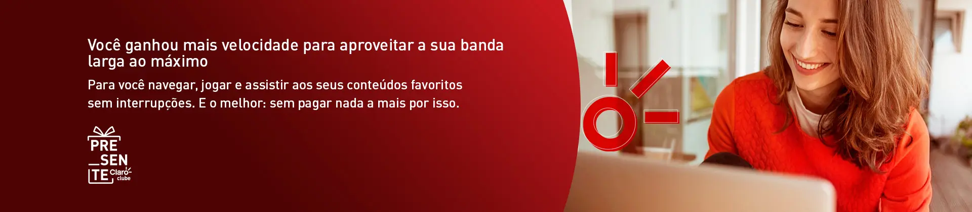 A Claro modernizou sua rede e agora o seu plano de internet teve um super aumento de velocidade sem custo adicional. Para conferir, acesse as informações do seu plano pelo app Minha Claro. Isso tudo porque para nós, você é um cliente especial. Queremos que você possa usar todo esse poder da conexão em momentos de lazer, no seu home office, ou simplesmente navegando pelas notícias.